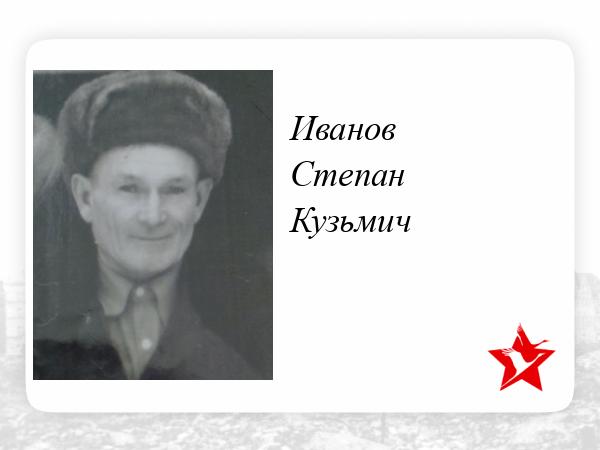 Мой дед Иванов Степан Кузьмич родился 28.02.1921г. в большой крестьянской семье. У него было 6 братьев. Учился в железно-дорожном Алатырском техникуме окончил 3 курса. В 1940 году был призван в Армию С 1941 по 1945 принимал участие в боях механиком-водителем. Когда выбирался из окружения под Ленинградом, очень сильно простыл и был отправлен в госпиталь После госпиталя проходил службу в Буйском танковом училище, инструктором-механиком до 1946 года все медали и ордена заслуэенные во время службы раздал детям и внукам.