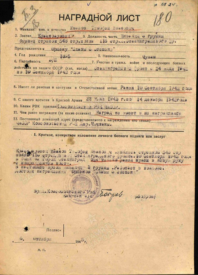 ИВАНОВ Тимофей Иванович (1895 - 1953 гг), до призыва работал слесарем кузнецом, призван 05.1942г, рядовой, военное обучение прошел в 357 зсп г. Канаш, мр 127, выбыл 5.7.42г на СЗФ 50А. Принят 14.7.42г в 116 сд. Зачислен в 548 сп. Бои в районе г. Мосальска. 18 августа 42г попали под сильную авиа бомбёжку у ст. Козельск. Переброшены на СТАЛИНГРАДСКИЙ Фронт, разгрузились 28.8.42г около ст. Фролово, маршевый переход 240 км в район совхоза Котлубань. Вместе с 24 сд брошены в бой 3.9.1942г. Кровавые бои в районе ВЫСОТА 112,7 около п. Кузьмичи. В многократных атаках на фашистов потеряли ранеными и убитыми практически всех бойцов стрелковых полков. Маршал Жуков в своих воспоминаниях отмечал, что эти потери были не напрасными - они оттянули на себя от СТАЛИНГРАДА значительные силы врага. Без героических жертв этих частей СТАЛИНГРАД бы не минуемо пал!