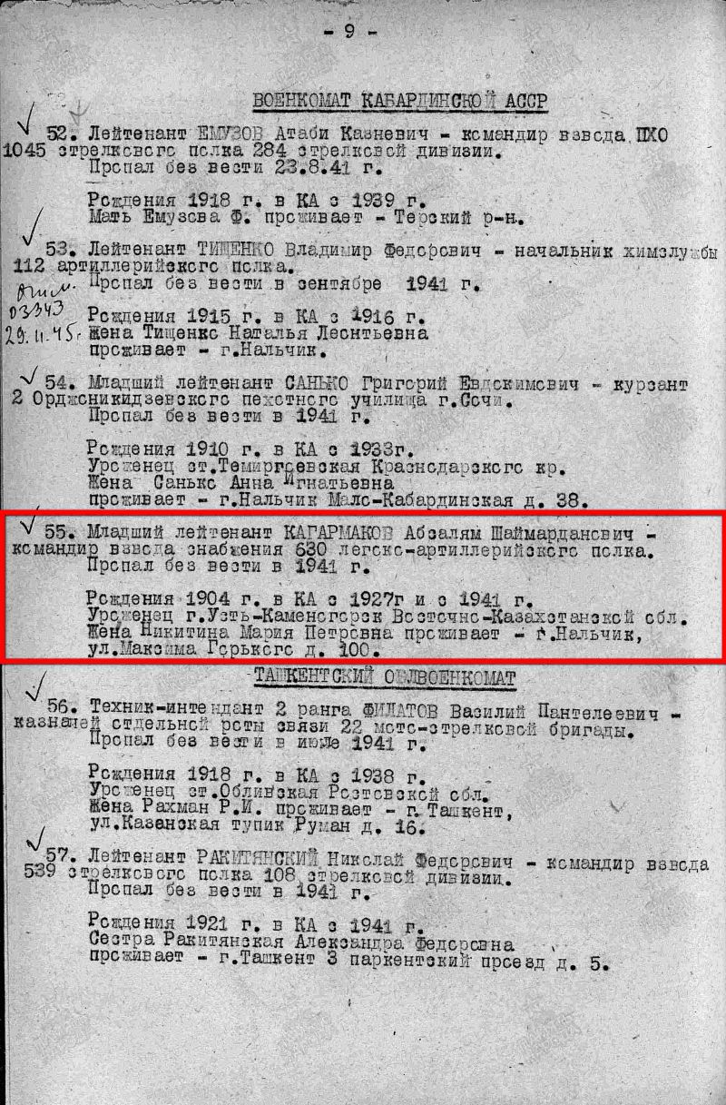 ОБД Мемориал: Кагарманов Абсалям Шайморданович, мл. лейтенант : Информация из документов, уточняющих потери