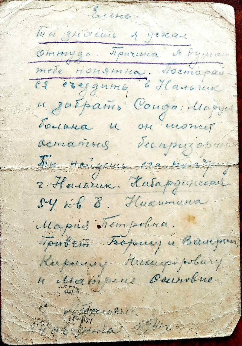 С фронта сохранились два полевых письма, последнее 6 сентября 1941 года из-под Киева. В восьмидесятых годах пытались в поездке под Киевом и в Киеве найти следы пропавшего полка или дивизии – памятник или мемориал на то время не нашли. Подавали заявку в 2011 году на внесение этих данных в дополнительный выпуск Книги памяти по Кабардино-Балкарии (по месту жительства и призыву), но дополнительный выпуск до сих пор не вышел.