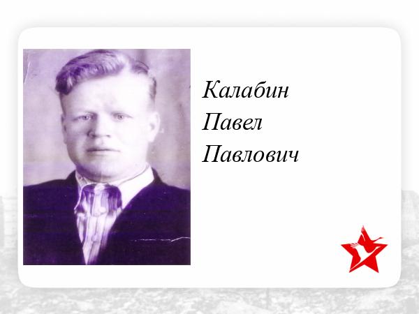 Калабин Павел Павлович, родился 9 августа 1920 года в деревне Кудрявцево Низовского сельского совета Харовского района Вологодской области. На момент начала Великой Отечественной войны работал секретарем в Низовском сельсовете, осенью 1941 года был призван в ряды Красной армии. Участвовал в боях за Украину в составе 116-й стрелковой дивизии, в апреле 1943 получил тяжелое ранение ноги, после которого работал на оборонном предприятии в Челябинске. Награжден орденом Отечественной Войны 1-ой степени.
