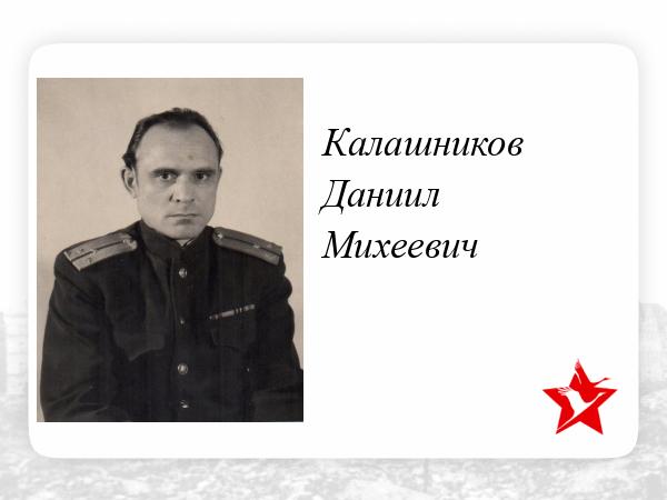 Калашников Даниил Михеевич (дату рождения и смерти не могу установить) родной брат моего дедушки Калашникова Ивана Михеевича. Лично с дедом Даниилом не была знакома, но из книги деда Ивана, которую он написал для нас - потомков, можно понять, как тяжело пришлось в годы войны. Дедушка описывает воспоминания брата Даниила о войне, вот одно из них: "Трудно представить, что в эту войну, с автоматами и пулеметами, минометами и артиллерией, танками и самолетами, могли быть рукопашные сражения. Но как утверждают очевидцы, они случались при взятии окопов, оборонительных сооружений...В этом бою Даниил был ранен в плечо, но сражался до конца. После госпиталя вернулся в свою часть, и его фронтовая жизнь продолжалась. Однажды, сломив сопротивление врага и преследуя его, ворвались в один из городов Украины, но сразу взять его не смогли. Отступающие немцы, используя дома и сооружения, как укрытия, сгруппировав оставшиеся силы, начали сдерживать наступление. Бои возникали за отдельные кварталы, улицы и дома. В осовобожденном районе грода командование части, выбрав удобное место для нблюдательного пункта, продолжало руководить боем. Здесь же и находился Даниил. Заметив, что один из немцев занял удобную позицию в строении города и сдерживал, на этом участке продвижение наших воинов, командующий, обращаясь к рядом стоящим офицерам, приказал: "Убрать этого немца!". Даниил, имея звание капитана, был младшим по чину среди присутствующих и по долгу службы воспринял приказ в свой адрес. Он уничтожил немца, но, возвращаясь на наблюдательный пункт, получил ранение. За выполнение этого приказа он был награжден комндованием орденом Красного Знамени. И вновь был госпиталь, выздоровление, возвращение в часть и опять - будни грозной войны.... После войны Даниил, как кадровый офицер, в чине капитана контрразведки в течении десяти лет продолжал службу в Восточной Германии, а затем в военном округе Узбекистана."