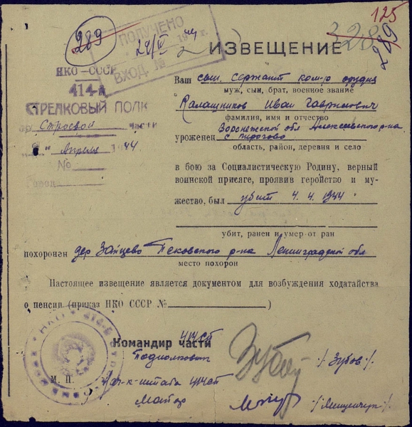 Уроженец Воронежской области, Алексеевского района, села Пирогово, 1923 г. рождения, командир орудия 76 мм бат. 414 стрелкового полка 18 стрелковой дивизии 2 УА Волховский фронт, с 12.01 по 08.03.1943