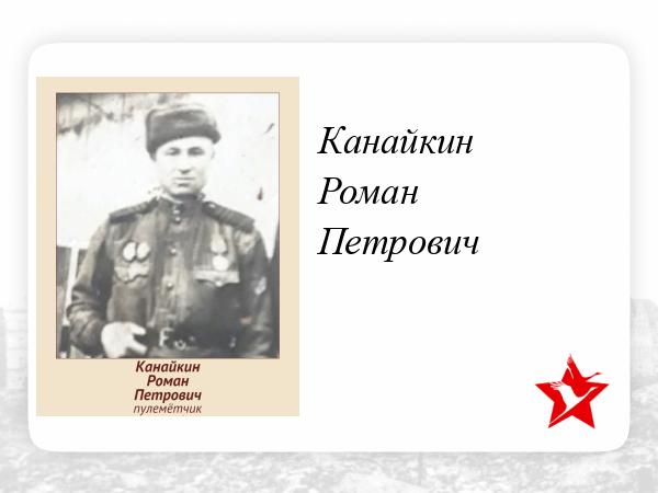Роман Петрович Канайкин родился в 1912 в селе Новая Карьго, Атюрьего района, Мордовской Республики. Прошел всю войну с 1941 по 1945 год. Был пулемётчиком, награждён орденами и медалями "За отвагу". Мобилизован по ранению, незадолго до окончания войны. В послевоенное время работал в колхозе. Умер в 1957 году в связи с многочисленными ранениями.