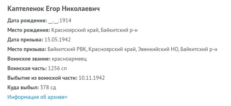 Капчуленок Егор Николаевич, 1914г.р Место рождения Красноярский край, ЭНО, Байкитский район. Эвенк. Призван Байкитским РВК в 1942году. Красноармеец. Стрелок. В/ч 1256 сп 378 сд.Участник обороны Ленинграда. Ошибка в документах на сайте Память народа, фамилия Каптеленок.