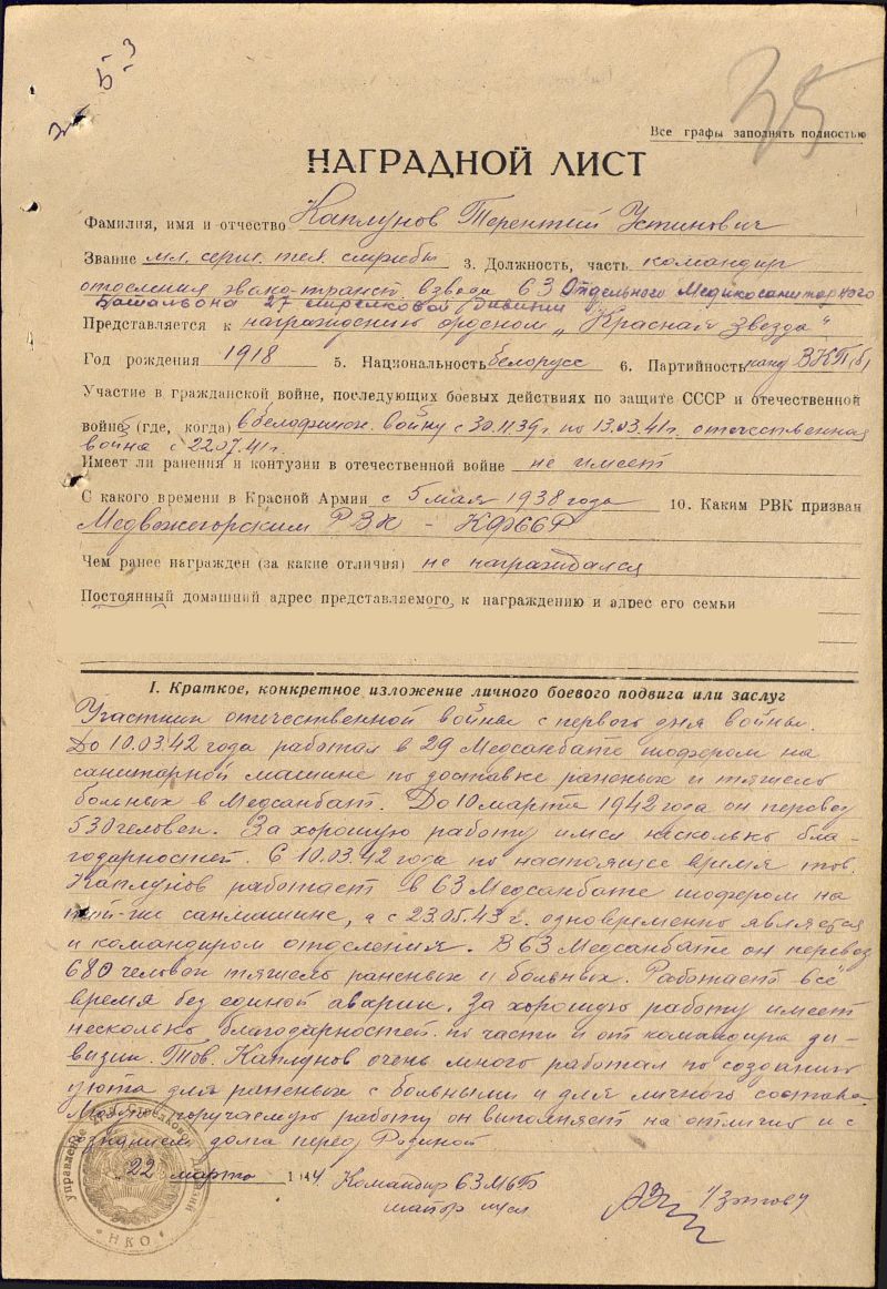 С первого дня войны по март 1942 года мой дедушка работал в 29-м медико-санитарном батальоне командиром автомобильного отделения.