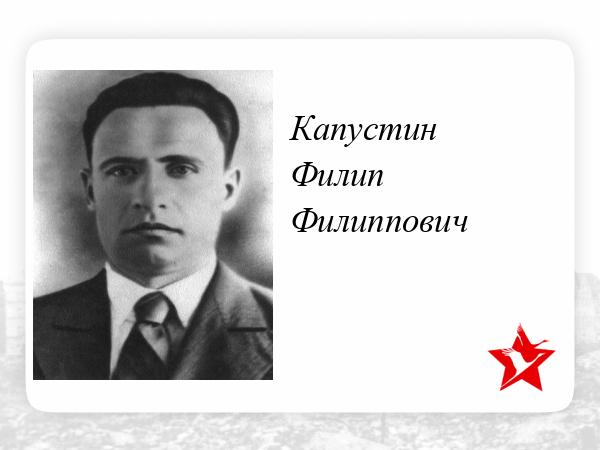 В августе 1941 года еще один мой дедушка Филип Капустин был призван в действующую армию . учавствовал в боях против фашистких захватчиков. Попал в окружение в районе Селидово Сталинской ( Донецкой ) области. Из окружения пробрался домой в г. Новоэкономическое ( Димитров) . В период оккупации немцами работал на шахте машинистом врубмашины. Организовал подпольно-патриотическую группу , которая совершала диверсии на шахте . На квартире дедушки проходили совещания патриотической организации . Под его руководством распостранялись листовки , сводки информбюро , газеты "Коммунист", оказывали помощь военнопленным продуктами , одеждой и документами немецкого образца . Устраивал на лечение в больницу г. Новоэкономическое раненых в феврале 1943 года. Возглавил подготовку к восстанию в городе. В мае 1943 года арестован , в тюрьме подвергался жестоким пыткам . 24 июня 1943 года расстрелян за динзаводом в противотанковом рву. 30 сентября 1943 года был перезахоронен в братскую могилу в парке возле ДК имени " Артема" . В 1955 году перезахоронен в братскую могилу советских воинов на кладбище "Северное" .