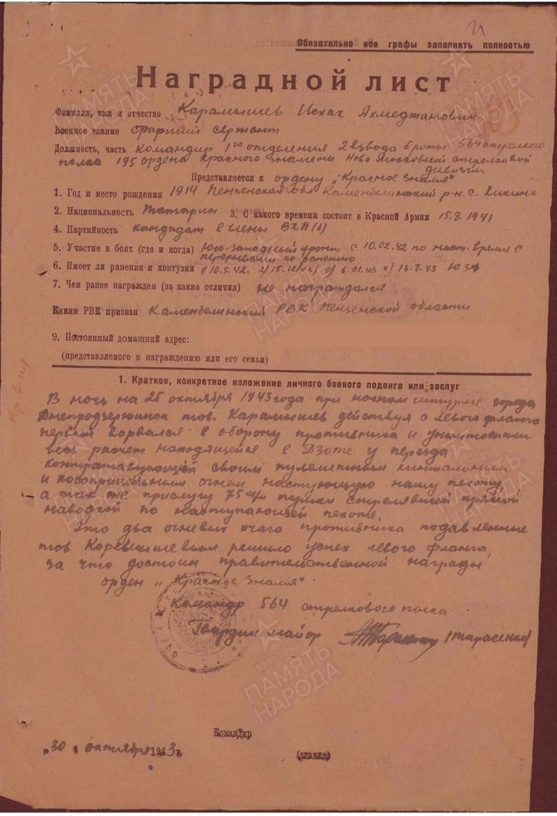 Карамышев Исхак Ахмеджанович родился в 1914 году в селе Кикино, Каменского р-на, Пензенской области. Поступил на службу 15.08.1941 г. Военное звание – старший сержант, являлся командиром 1-го отделения 2-го взвода 5-ой роты 564-го стрелкового полка 195-ой НовомосковскойКраснознаменной стрелковой дивизии 84-го стрелкового корпуса. Также был кандидатом в члены ВКП (б) – Всесоюзной коммунистической партии большевиков.
