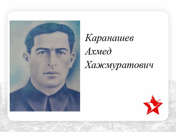 Ахмед Каранашев родился 11 апреля 1922 года в селе Заюково Баксанского района. Его родители Хажмурат Дзадзинович и Лела Кербековна были простыми людьми – отец был крестьянином, мать занималась детьми и домашним хозяйством. Ахмед был старшим из девяти детей. В 1931 го-ду он поступил в заюковскую среднюю школу, которую окончил в 1941 году, вступил в комсомол.