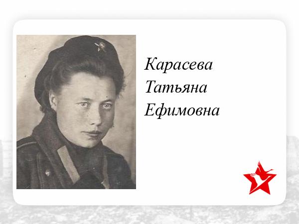 Позднее, зимой 1941г., Карасева Т.Е., обратившись добровольцем в райвоенкомат, была направлена на службу в ряды органов внутренних дел г. Москвы, где она прослужила до конца войны.
