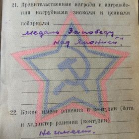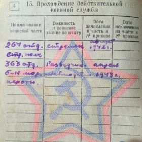 Воевал в 264 отд. стрелком и 363 отд. разведчиком. 9 августа 1945 года по 3 сентября 1945г. поевал с Японией за что получил медаль "За победу над Японией"