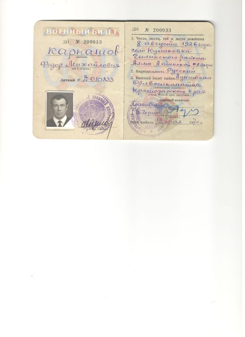 Мой дедушка, Карнашов Федор Михайлович, родился 8 августа 1926 года в Казахстане, в маленьком селе Куликовка (сегодня это село Сарыбулак в Енбекшиказахском районе Алматинской области Казахстана, входит в состав Каражотинского сельского округа). Школы в селе не было, епоэтому в детстве дедушке приходилось ежедневно преодолевать пешком восемь километров, чтобы попасть в школу в соседнем населенном пункте. А когда началась война, дедушке не было еще и пятнадцати лет... Школу он тогда не окончил. Пошел добровольцем на фронт. В призывном пункте соврал - накинул себе пару лет, сделал вид, что уже совершеннолетний, а так как он был рослым, крепким парнем, его взяли, не проверяя документы.