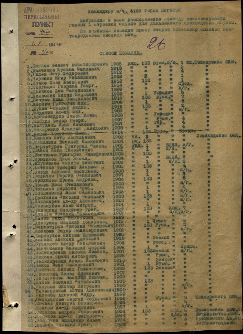 Карнаухов Иван Митрофанович, 1900(1897)г.р. Место рождения Красноярский край, Кежемский район, д.Заимка. До войны жил в Красноярском крае, ЭНО, Тунгусо-Чунский район, ф.Оскоба. Призван Тунгусо-Чунским РВК в 1942году. Красноармеец. Ездовой, стрелок. В/ч 104 гв сп 36 гв.сд 57 А.,23 сп 51 сд.Награжден медалью За отвагу (подвиг 27.09.1943).Ранен 28.10.1943.Отметка ВПП 60зсп 10.06.1944 выбыл 176 азсп. Награжден орденом Славы 3 степени (подвиг 22.06.1944) Последнее письмо родные получили от 23.06.1944,п/п 28032,которая подчинялась в/ч 23 сп 51 сд.Признан пропавшим без вести в сентябре 1944 года(1941 ошибка).Жена Карнаухова Анна Варфоломеевна.Сын Карнаухов Степан Иванович, 1926г.р пропал без вести в марте 1944 года.