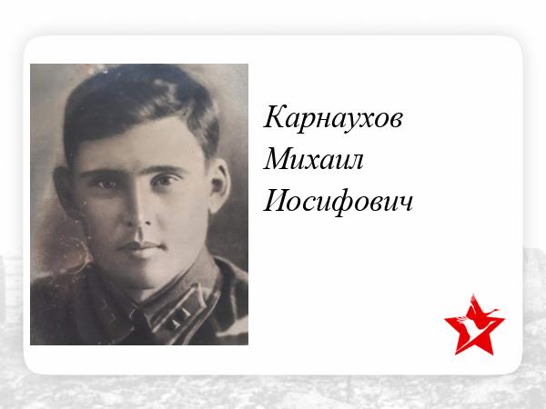 Карнаухов Михаил Иосифович, 1918г.р Место рождения Красноярский край, Кежемский район, д.Фролово. Призван в ряды РККА в 1937 году.Призван Красноярским ГВК 15.01.1940 года.Лейтенант.Командир роты.В/ч 634 сп 17 гв.сд .,48 гв.сп 17 гв.сд (В разные периоды подчинения 119 сд,54 сд.)Признан пропавшим без вести в сентябре 1941 года.Ранен 7.11.1941. Умер от ран 8.11.1941 года.Похоронен Смоленская область, Сычевский район, д.Алексино.(деревня была оккупированна в октябре 1941 года,освобождена в марте 1943 года.Жена Шуринова Мария Игнатьевна.