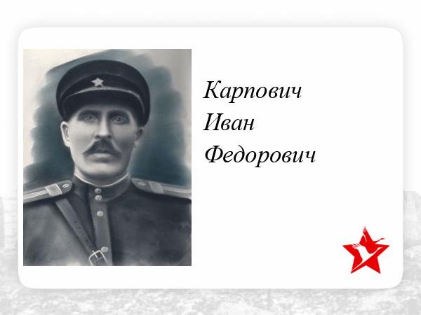 Карпович Иван Федорович родился в 1889 году в городе Барановичи (Белоруссия). В 1938 году принимал участие в Советско-Японской войне, в 1939 году - Советско-Финской войне, с 1941 по 1945 гг. в Великой отечественной войне. Был командиром танковой дивизии. В 1944 году тяжело ранен. В мае 1945 года вернулся с фронта инвалидом.