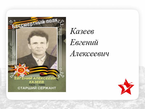 Казеев Евгений Алексеевич родился 8 марта 1925 г. в селе Жуково Торбеевского района Мордовской АССР. 8 января 1943 года, когда ему исполнилось 18 лет, он был призван в ряды Советской Армии для защиты Родины. В начале был направлен во Владимировскую танковую школу, после окончания которой попадает в 8-ю гвардейскую армию 1061 артиллерийский полк, под город Ковель, назначен командиром СУ– 76