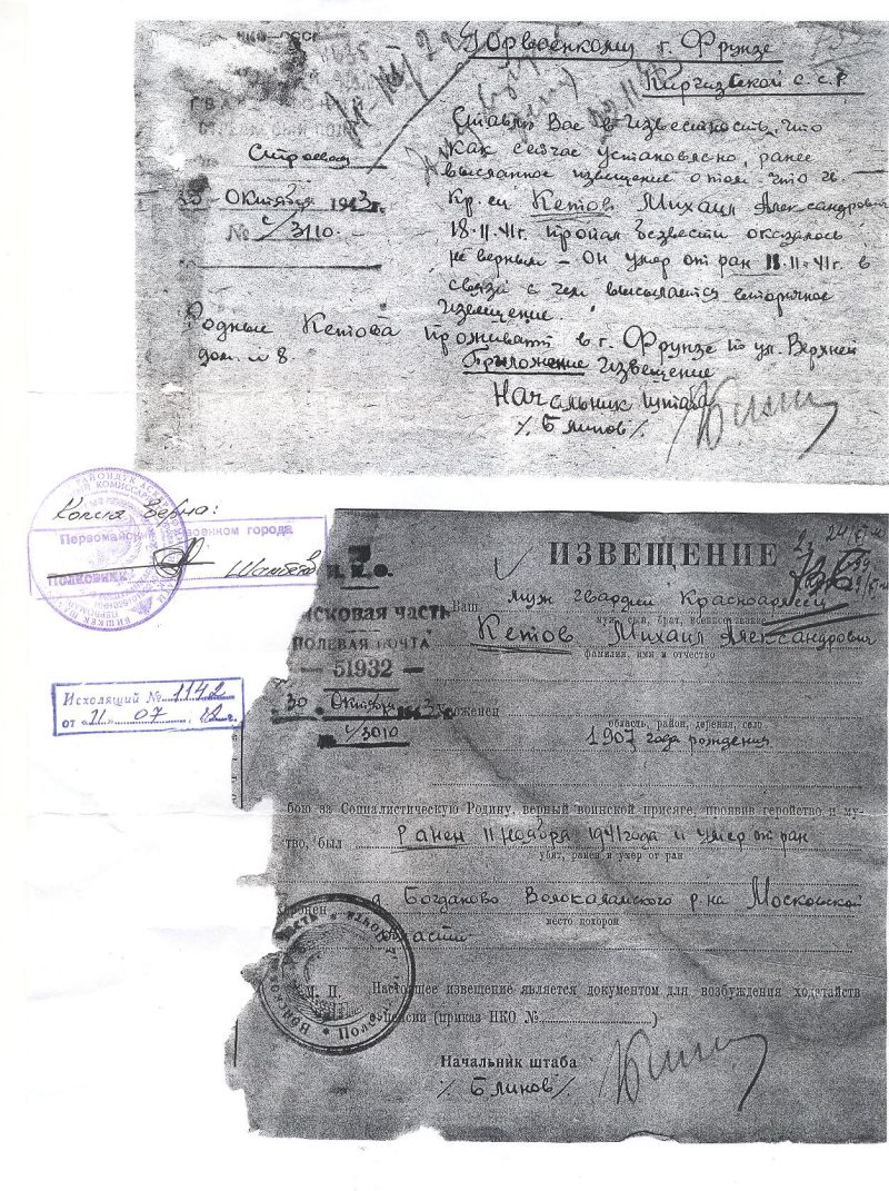 Кетов Михаил Александрович - рядовой. Родился в 1907 г. в г.Фрунзе. В 1941 году был призван на фронт, с 10 на 11 ноября 1941г. тяжело ранен в бою, о чем свидетельствует письмо его командира - И.Р.Никитина. При перевозке в госпиталь, скончался и был похоронен в д.Богданово, Волокаламского района, Московской области.