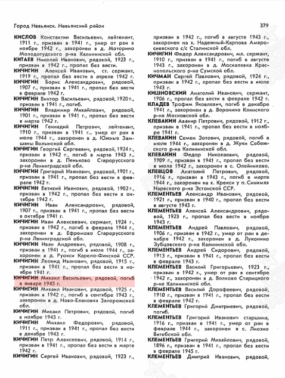 “Кичигин Михаил Васильевич . п.Верх-Нейвинск, мл. сержант, призван 21.02.42г Невьянским РВК. Погиб 26 января 1945 года , сбит в воздушном бою, упал на территорию противника. Извещение 0117 от 17.02.45г- 6-й бомбардировочный авиаполк. Работал в ремонтно-механическом цехе( Алфавитная книга) стр. 258 книга” Память 1995 г п.Верх-Нейвинск"автор Кукарцева Татьяна Ивановна.