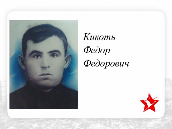 Кикоть Федор Федорович родился 06.04.1911 года в с.Арзгир Орджоникидзевского (ныне Ставропольского) края.Жена Анна Михайловна.Был мобилизован в ряды Советской армии в 1941 году Арзгирским РВК, Ставропольский край, Арзгирский р-н в звании Красноармеец.Служил в 589 стрелковом полку.