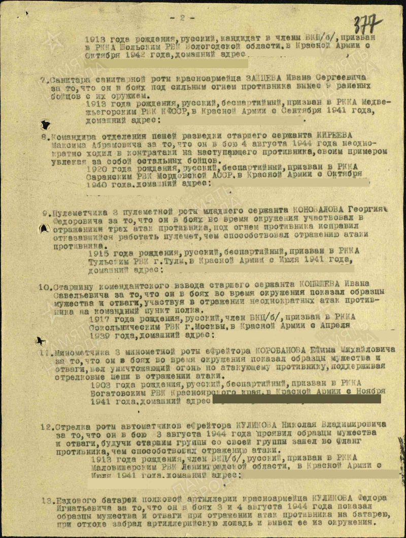 Мой дед Киреев Максим Абрамович попал на войну из армии. 27 сентября 1940 года был призван в ряды РККА, попал служить в Карело-Финскую АССР. С декабря 1941 года по июль 1944 года воевал на Карельском фронте в составе 1044-го стрелкового полка. Затем - на Мосельском и Приозерском направлениях, под его началом была рота автоматчиков. Четырежды был ранен, и поэтому демобилизован из армии в октябре 1945 года. Награжден Орденом Отечественной войны II степени, медалью "За Отвагу". В наградном на медаль значится: "... за то, что в бою 04 августа 1944 года неоднократно ходил в контратаки на наступающего противника, своим примером увлекая за собой остальных бойцов". После войны работал по специальности счетоводом, бухгалтером в Лямбирском районе и Саранске Мордовской АССР. Вырастил дочь и сына, четверых внуков. Умер в результате онкологического заболевания 21 мая 2000 года.
