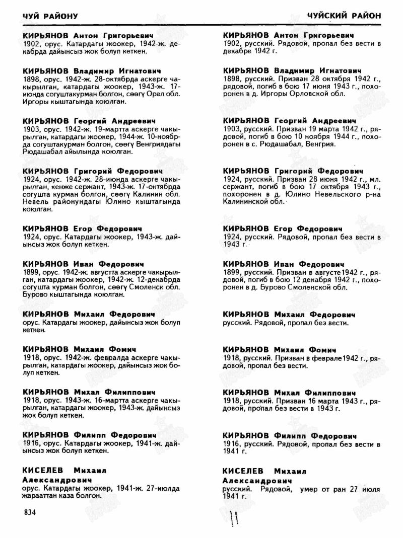 Кирьянов Филип Федорович родился в с.Старо-Покровка Чуйского района Киргизской ССР в 1916 году. Женат на Кирьяновой Александре Александровне, у них родилась дочь Люба. Призван в армию 26.11.1939 года.