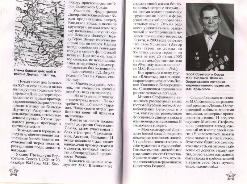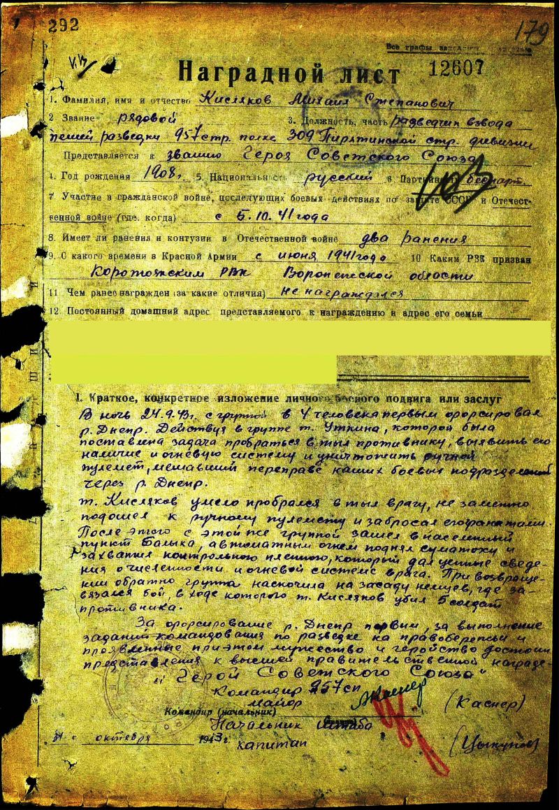 На фронт М.С. Кисляков призван в октябре 1941 года. Участвовал в боях под Смоленском, Воронежем, Сталинградом, на Украине разведчиком 957 стрелкового полка 309-й гвардейской стрелковой дивизии Юго-западного фронта, вышедшего осенью 1943 года к Днепру. Сюда прибыл после ранения и излечения в госпитале Михаил Кисляков.