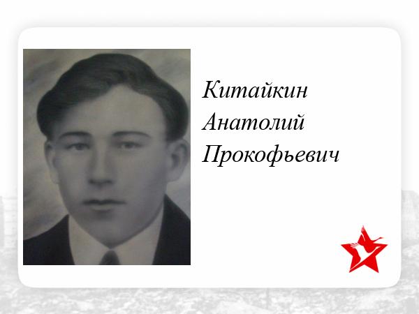 В1943г. в Баеве было 10 юношей 1926 года рождения,13 ноября пятерых из них, в том числе и Анатолия Китайкина, призвали в ряды Красной Армии. Служба началась в городе Слободское Кировской области. Он был зачислен в роду 82-х миллиметровых минометов 282 запасного стрелкового полка
