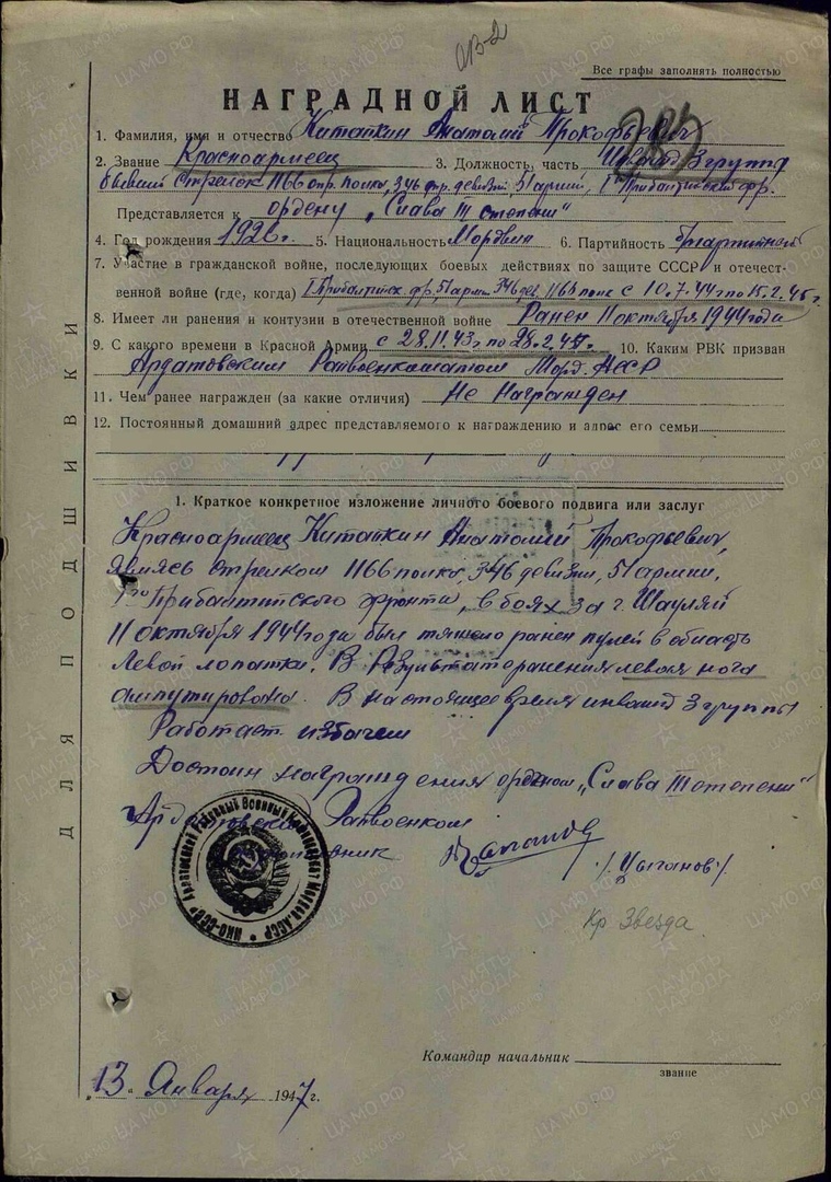 В конце апреля 1944 года Анатолия в числе других солдат направили в город Киров ,чтобы подготовить из них младших командиров .Но потом срочно перебросили назад в Слободское, одели во все новое, погрузили в военный эшелон и повезли в Смоленскую область на станцию Издешково. Оттуда маршем в сторону города Ельня. Китайкин А.П. и его земляк из села Малое Кузьмино Николай Дмитриевич Бакунов были определены в стрелковый полк. Предстояло первое боевое крещение. – Шли мы в основном, ночью, а днем нас продолжали обучать военному мастерству. Прошли через Смоленск, форсировали Днепр и подошли к литовской границе, где в то время шли бои. Остановились, стали рыть окопы. Впереди нас стояла 32-я гвардейская стрелковая дивизия, которая вела бой с немецкими танками, продолжал рассказ Анатолий Прокопьевич. – Дивизия не устояла. Немцы прорвали линию обороны. Наши части несли большие потери. Анатолий Прокопьевич, командир отделения и еще 2 солдата ползком стали отходить в сторону небольшой рощицы. Немцы их заметили и стали стрелять .Несколько пуль попало вещевой мешок Китайкина. Перед ними, метров 40-50, грохоча гусеницами, проезжал немецкий танк. За ним-еще 1, совсем рядом, осыпал землей укрывшихся в траншее солдат. После ухода последних немецких танков вглубь обороны наших войск, оставшиеся в живых и раненые стали стекаться к рощице. Вскоре пришло известие: немецкие танки остановлены и разбиты. К рассвету другого дня солдаты расположились в поле, уже в кем-то вырытых траншеях. Ими в этот же день была совершена разведка боем и был освобожден населенный пункт. За пленение немецких солдат командир роты обещал, что на шестерых солдат оформит документы на представление к Ордену Славы 3 степени. К большому сожалению, обещанные награды солдаты не получили. Всякое было на поле боя. Когда форсировали реку Лиелупе, командир роты послал Анатолия на командный пункт( доложить о готовности роты к форсированию реки). При переправе почти все солдаты погибли, а ему посчастливилось остаться живым. Во время бомбежки погиб земляк Анатолия, Николай Бакунов. Когда он подошел к КП, то увидел страшную картину. Произошло прямое попадание вражеского снаряда в КП, вся земля вокруг была изрыта. Из разговоров офицеров и данных разведки, солдаты узнали, что 346 и 347-я дивизия оказались в окружении, но продолжали вести упорное сопротивление немцам.