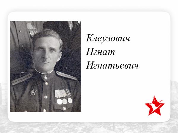 В армию был призван в возрасте 48 лет, из-за чего был определён в обоз. Находясь в Ростовской области вёз обоз с продовольствием попал в окружение. Когда был убит командир, он взял командование на себя, т.к. ещё в Первую Мировую войну был командиром разведроты. По захваченной фашистами территории он провёл обоз сохранив людей, продукты, лошадей вышел к Чёрному морю в районе Новороссийска. В это время была тяжёлая обстановка, люди голодали, резали ремни и варили. И он как раз привёз продовольствие. Помимо этого он ещё встретил своих сыновей: Георгия Игнатьевича и Николая Игнатьевича Клеузовичей, которые вели там бои.