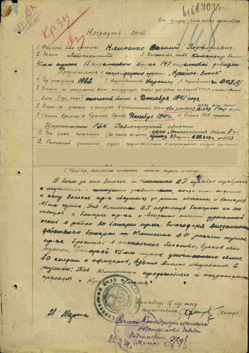 Когда началась Война, моему дедушке Клименко Василию Порфировичу было всего 19 лет. Он закончил срочные артиллерийские курсы и попал на фронт 1 мая 1943 года. Служил в 15 стрелковом полку 147 стрелковой Станиславской дивизии на Воронежском и на 1 и 2 Украинских фронтах. Будучи командиром огневого взвода батареи 45мм пушек, за время боев из своих пушек уничтожил только под ст. Кириковка 4 танка, 3 автомашины и до взвода солдат и офицеров. В боях под дер. Будки (Будково), когда пехота пошла в атаку, Василий Клименко со своим взводом продвигался сразу же за боевыми порядками пехоты и, руководя огнем батарей своего взвода, осколочными снарядами поражал пехоту противника и обеспечивал продвижение нашей пехоты. После взятия дер. Будки (Будково) противник, пытаясь восстановить свое положение, бросил в контратаку до 6 танков и десант автоматчиков. Василий Клименко сам лично открыл сильный огонь по танкам противника и 2 из них были подбиты, в результате чего противник был вынужден отступить с большими для него потерями. За проявленное мужество и находчивость Клименко В.П. был награжден Орденом Отечественной войны II степени 26.10.1943г.