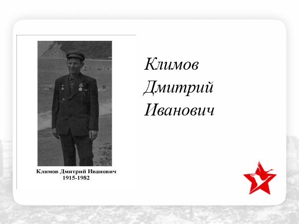 Климов Дмитрий Иванович, родился в 1915 году, умер в 1982 году. Участник Великой Отечественной войны 1941-1945 годов.