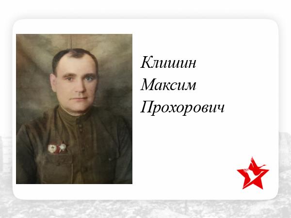 Мой дед, Клишин Максим Прохорович , начал свой боевой путь еще в 1939 году. Участвовал в боях с белофинами с ноября 1939 по март 1940 года. Как только началась Великая отечественная война, он был призван в городе Ленинграде. И с 27июля 1941г и по март 1944 г. был начальником компрессорной станции. В начале 1945 года был тяжело ранен, лежал в госпитале, где ему ампутировали ногу, и 7апреля 1945 года был уволен из армии из-за ранения.