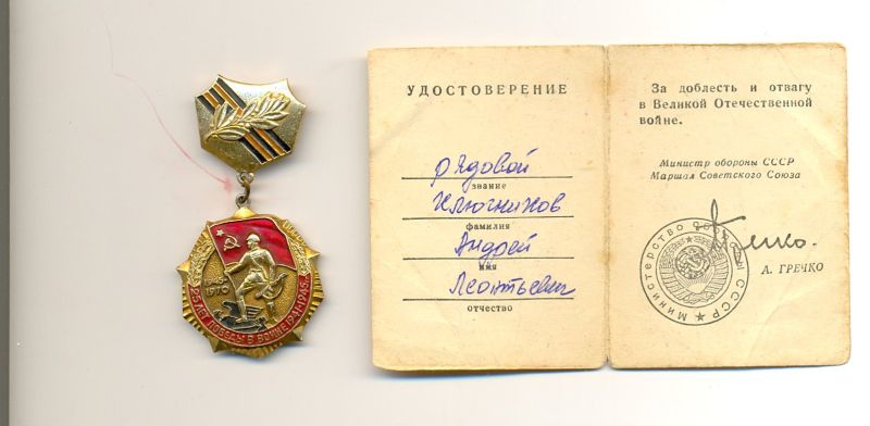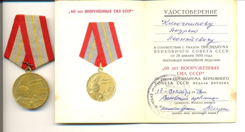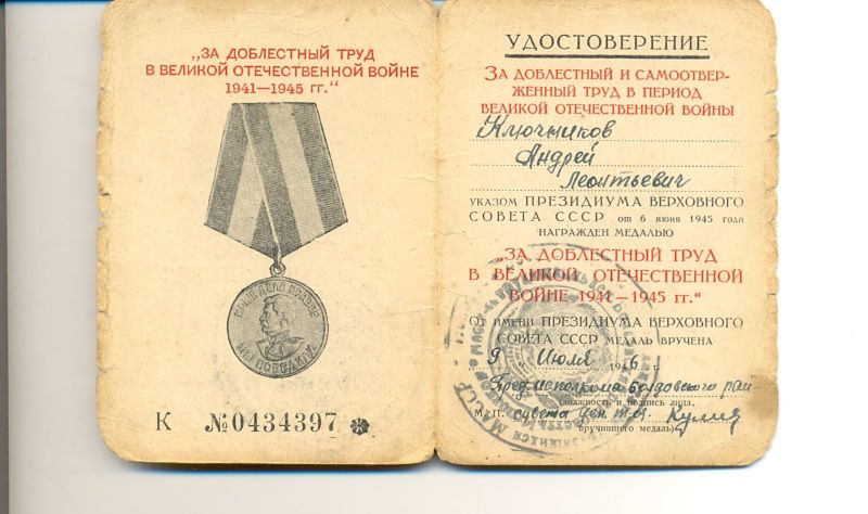 Однако документы о том, что дедушка являлся участником Великой Отечественной войны, были утеряны. Но его неоднократно награждали юбилейными медалями Дня Победы. Стараниями его младшего сына и невестки (моих бабушки Ключниковой Нины Алексеевны и дедушки Ключникова Петра Андреевича) данные документы были восстановлены, и прадедушка получил все льготы и почести Ветерана Великой Отечественной войны.