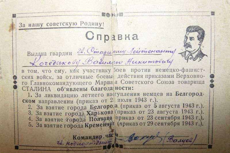Из рассказов деда помню про бой на Курской дуге, он его несколько раз рассказывал. Говорил, как солдатам было очень тяжело, как они погибали. Как они сберегли его, выкопав в земле щель. Про то, как он лично прямой наводкой подбил 2 танка, я узнал лишь спустя много лет. За этот и другие подвиги он награжден орденом «Красная звезда», двумя орденами «Отечественная война» I и II степени, орденом Боевого Красного знамени. Да еще - двенадцать благодарностей Верховного Главнокомандующего за участие в крупнейших боевых операциях.