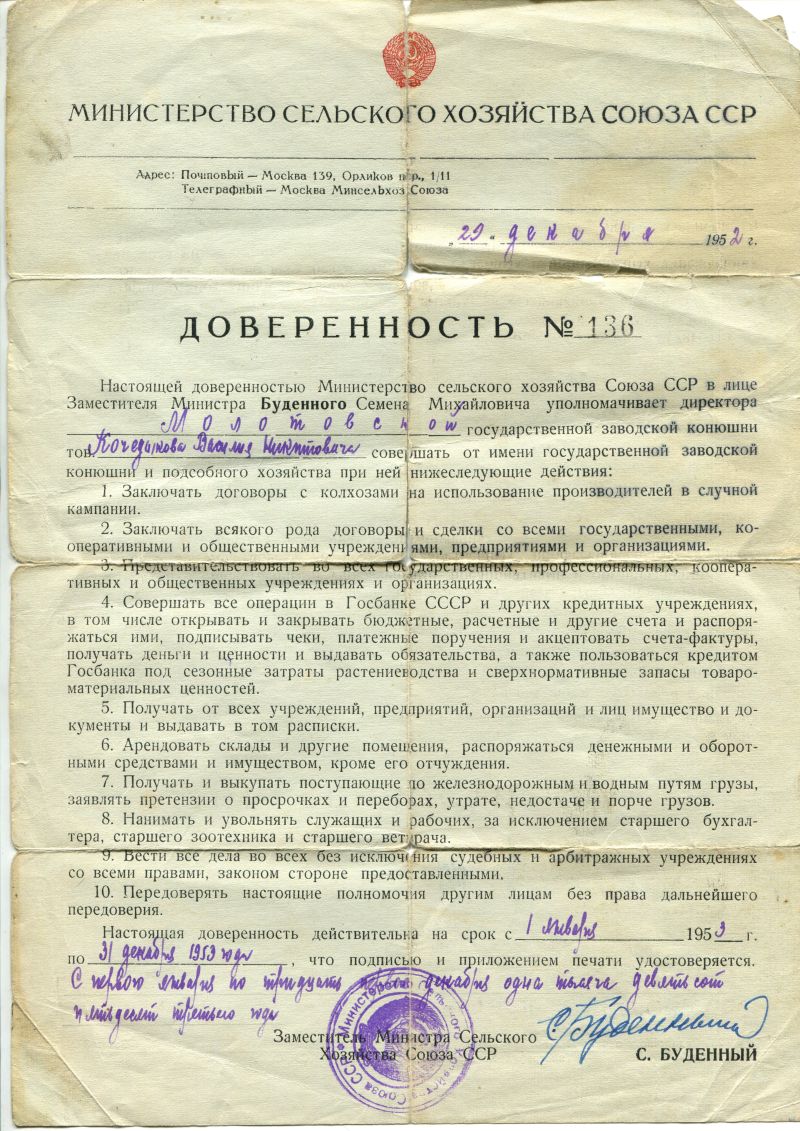 Война для гвардии капитана Кочедыкова В.Н. окончилась в сорока пяти километрах от Берлина - одновременно с третьим ранением. Потом - госпиталь во Львове, комиссия и увольнение из рядов армии. Там и состоялось знакомство Василия Никитича с Буденным, руководившим тогда коневодческой индустрией в стране. Маршал утверждал назначение вчерашнего офицера директором госконюшни во Львове. Затем работал в Ровенской государственной заготовительной конюшне, куда после войны приехал работать его родной брат Виктор Никитович Кочедыков. Дед был директором госконюшни, председателем колхоза «Прогресс» Нолинского (Молотовского) района Кировской области, с первого колышка создавал Нолинскую птицефабрику.