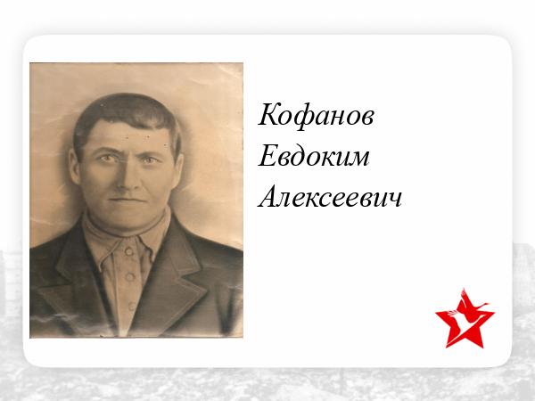 Кофанов Евдоким Алексеевич 1902 года рождения, уроженец станицы Сенгилеевской, Орджоникидзевского края, Ворошиловского района. В августе 1941 года ушёл на войну. В сентябре этого же года попал в плен в г. Одесса. Военнопленный лагеря №1 «Слобозия», затем лагеря № 7 Бельцы (Румыния) и только в 1944г. был освобождён Красной армией. После проверок, отправили в штрафную роту. Рядовой, стрелок 223 стрелкового полка 53 стрелковой дивизии 53 Армии 2-го Украинского фронта. В жесточайших боях при наступлении на Будапешт, при форсировании реки Тиссы, 2 ноября 1944 года погиб и похоронен в районе д. Сапари Сольнокского уезда (Венгрия), согласно именного списка безвозвратных потерь.
