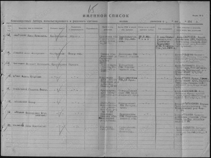 Колесников Гавриил Федорович,1909г.р. Место рождения Красноярский край, Северо-Енисейский район. Призван Северо-Енисейским РВК в 1941году. Красноармеец. Стрелок. В/ч 1078 сп 314 сд. Убит в бою 29.09.1942 года. Похоронен Ленинградская область, Мгинский район, д.Гайтолово,северо-западнее 1 км,квадрат 3400а.Жена Колесникова Анна Павловна проживала в Красноярском крае, Северо-Енисейский район, прииск Тей-Строй,д.171.