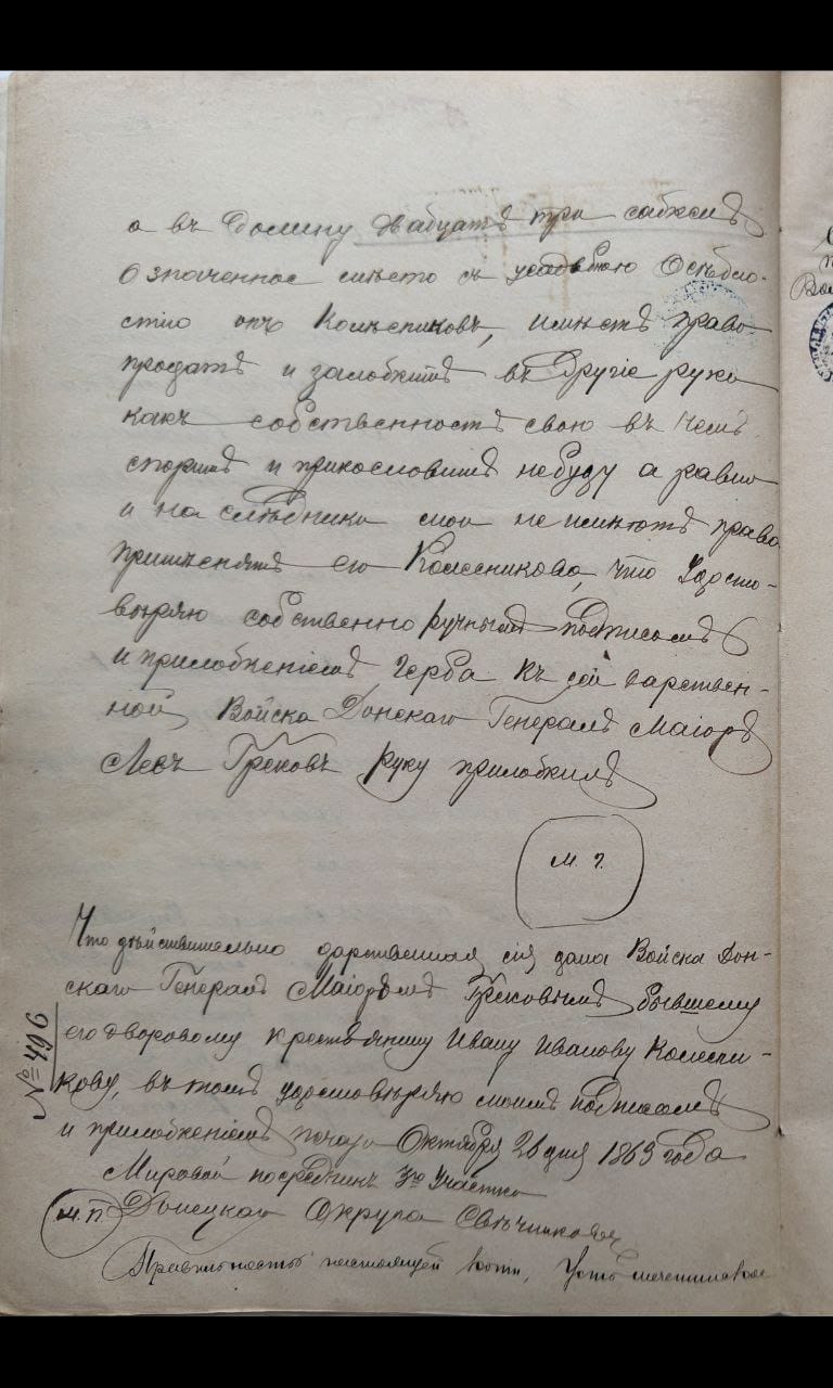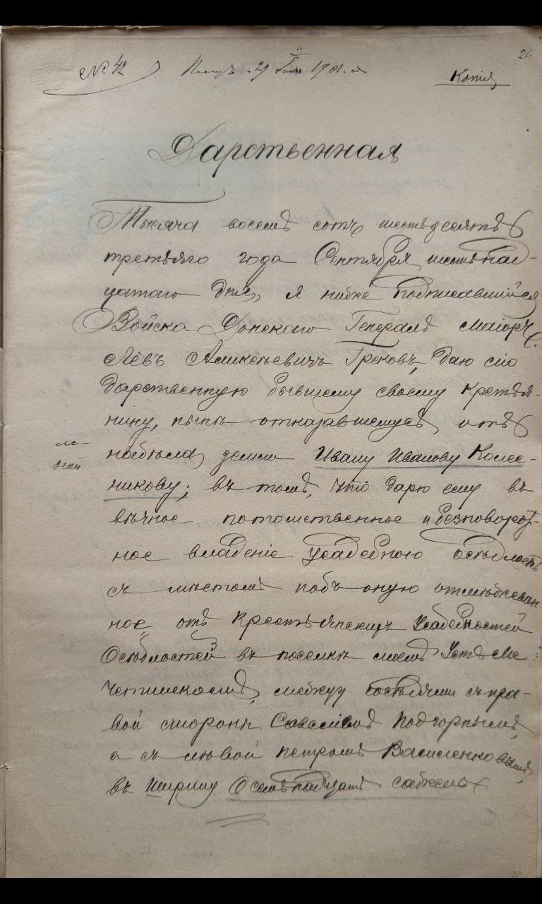 Эта дарственная была пришита к делу 1901 года, об окончательном отмежевывании земли крестьянам. Дарственная выдана Ивану Ивановичу Колесникову родному брату Устина Ивановича Колесникова (моего прадедушки и дяде моего дедушки Степана Устиновича Колесникова ).