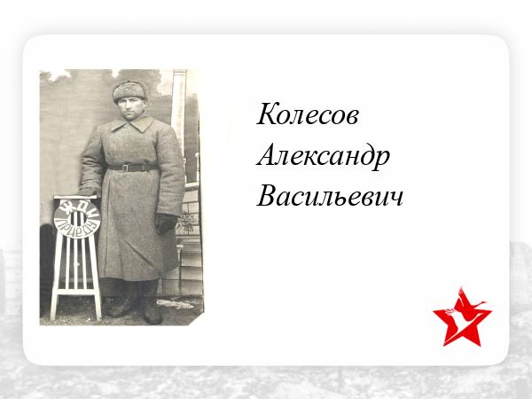 Мой прадедушка, Колесов Александр Васильевич, родился в Костромской области, Палкинского р-на, д. Зилово. На фронт ушел в первые дни войны. Из писем моя пробабушка, Колесова Мария Александровна, знала, что прадедушка был ранен в октябре 1941 года и отправлен в госпиталь в г. Свердловска. Писал, что после лечения сразу вернется на фронт, защищать свою родину. Подлечившись, отправился на фронт. Погиб 21 декабря 1941 в Калининской области (ныне Тверская область) Калининский р-н д. Черкасово. Похоронен в братской могиле, на берегу реки Волги, в д. Черкассы (ныне пригород Твери). У моего прадедушки было 3-е детей. И каждый из них вносил свой вклад в победу. Моя бабушка, Грибова Алефтина Александровна 1933 г. р.( в девичестве Колесова), работала ребенком на лесоповале. Работали и голодали, а когда пришла похоронка не верили, что прадедушка больше не вернется.