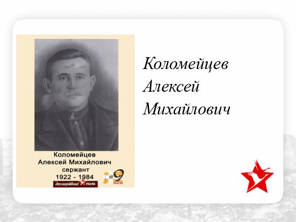 Коломейцев Алексей Михайлович .Звание-сержант. Годы жизни- 1922-1984 г.призывался-Зимовниковский РВК, Зимовниковского района, Ростовской области. Награды- 2 Ордена Красной Звезды, ордена и медали.