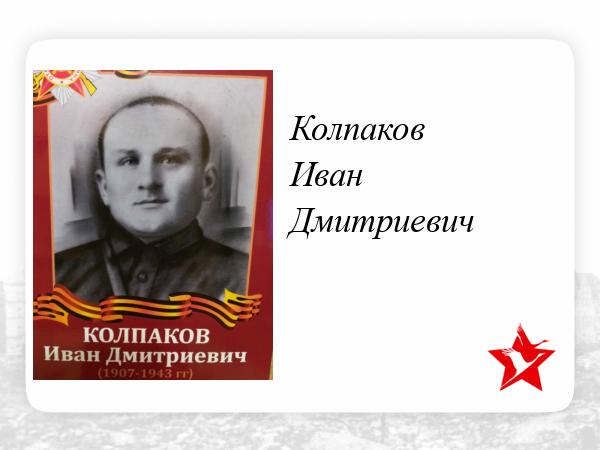 Мой дед Колпаков Иван Дмитриевич был призван на фронт в феврале 1943 года. Он был комбайнером и в начале войны имел бронь, так как нужно было кормить армию и народ. В связи с наступлением немцев и тяжёлыми боями на юге Росии в начале 1943 года Колпаков И.Д. был призван на военную службу Орловским РВК Ростовской области, а уже в августе 1943 года жена получила извещение о том, что ее муж без вести пропал под г. Таганрогом. Всю войну бабушка ждала от него весточку. У нее на руках остались 4 дочери: старшей было 10 лет, а младшей только исполнился 1 год. И только с приходом победы, когда в хутор стали возвращаться односельчане, бабушка узнала, что ее муж не вернется никогда. По расскажу сослуживцы, дедушка подорвался на фашистской мине при наступлении под Таганрогом. Это теперь мы знаем, что в то время там шли ожесточённые бои с огромными человеческими жертвами. Это была битва на Миус-фронте. Я горжусь своим дедом. Он отдал свою жизнь ради победы за наше счастливое будущее.