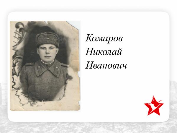 Наш Ветеран Великой Отечественной Войны (мой дедушка) Комаров Николай Иванович был призван 19 летним мальчишкой в 41 году. Сразу его в составе 548 арт.полка перекинули на границу Дальнего Востока, из-за угрозы нападения Японии. С ноября 1941 по февраль 1942 его полк находился там, а в феврале 1942 они были перекинуты в действующую армию. Дедушка проходил службу в составе 98 арт.бригады в должности разведчика-наблюдателя.