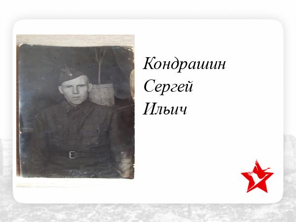 Кондрашин Сергей Ильич 1900 г.р (дедушка моей покойной свекрови Кондрашиной Римы Васильевны). Вот вся информация которая у нас осталась. Был призван на фронт в августе 1941 года Пресновский РВК Северо-Казахстанской обл. Рядовой артелирист, пропал без вести в мае 1944 года. На фото надпись "На долгую память любимому сыну Василию от твоего отца во время пребывания в госпитале в г.Ижевске 27 марта 1942 года." В феврале 1944 года его жена Кондрашина Анна Тимофеевна получила письмо, в котором Сергей Ильич сообщал, что лежит в госпитале г.Киев, имеет награды "Орден красной звезды" и "Медаль за боевые заслуги". Мы гордимся подвигами наших солдат и чтим память о них!