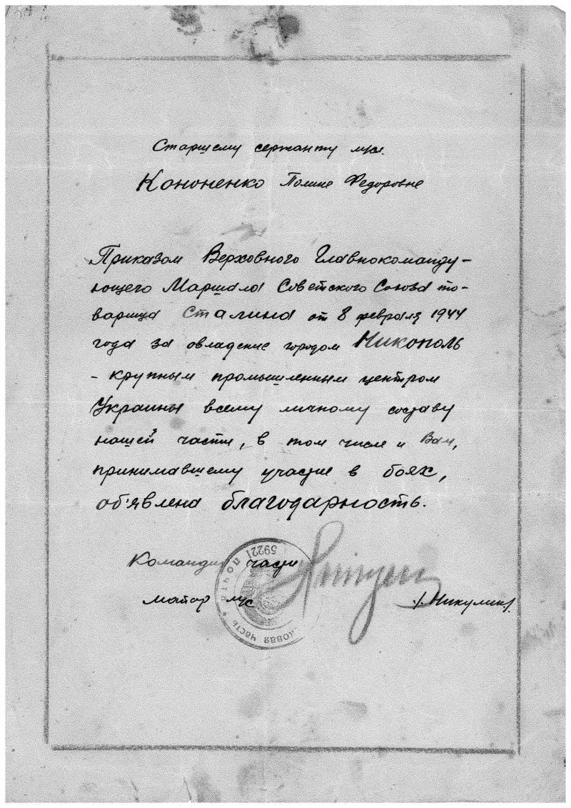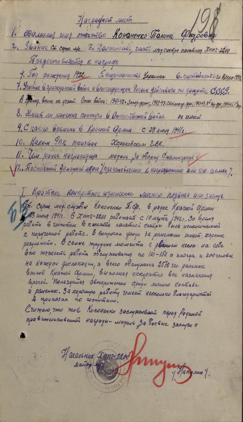 Моя бабушка, Кононенко Полина Федоровна, родилась 7 октября 1923 в Полтавской обл., Кобелякский район, село Бутенки. После школы поступила в медицинское училище, от куда 23 июня 1941 была призвана в ряды Красной армии и дошла до г.Берлин.