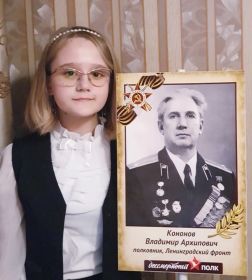 Кононов Владимир Архипович-защитник Ленинградской земли. В 17 лет ушел на фронт, воевал в звании рядового, сержанта с 1941-1944г. В январе 1943 года участвовал в прорыве блокады Ленинграда и ожесточенных боях за Синявинские высоты. В боях за нашу Родину он был четырежды тяжело ранен, но всегда после госпиталей, возвращался на фронт. Награжден орденами Отечественной войны 1 и 2 степени, орденом Красной звезды и 19 медалями, среди котрых есть медаль "За оборону Ленинграда ", " За отвагу", "За боевые заслуги". После войны поступил в военное училище и стал офицером танковых войск. Я ПОМНЮ И ГОРЖУСЬ!