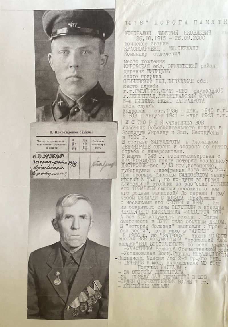 В марте 1943 г. госпитализирован с диагнозом: на посту потерял сознание, дистрофия - вес 43 кг, истощение, туберкулез, язва желудка, шизофрения. При прорыве блокады санпоездом эвакуирован.