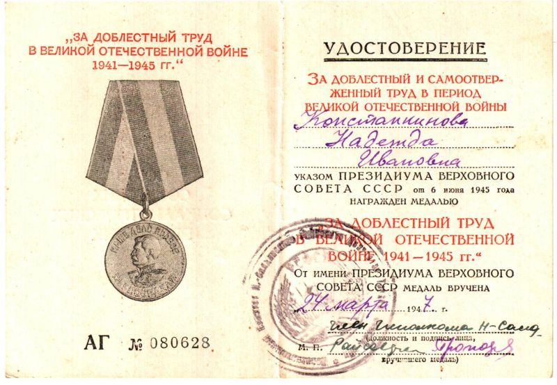 Мой дедушка родился в г. Нижняя Салда Свердловской области. В октябре 1941 года его призвали в Вооруженные силы Нижнесалдинским военным комиссариатам. С 1941 по 1942 год служил стрелком в 48 стрелковом дивизионе. Был ранен и с февраля 1942 года по июнь 1942 находился в госпитале, а уже с июля 1942 по сентябрь 1945 был командиром стрелкового отделения 38 гвардейской стрелковой дивизии. В великой отечественной войне был контужен (20.02.1942г.), легко ранен (16.09.1943г.) и тяжело ранен (05.12.1941г.). Награжден «Орденом славы III степени», «За боевые заслуги», «За победу над Германией», «За оборону Сталинграда».