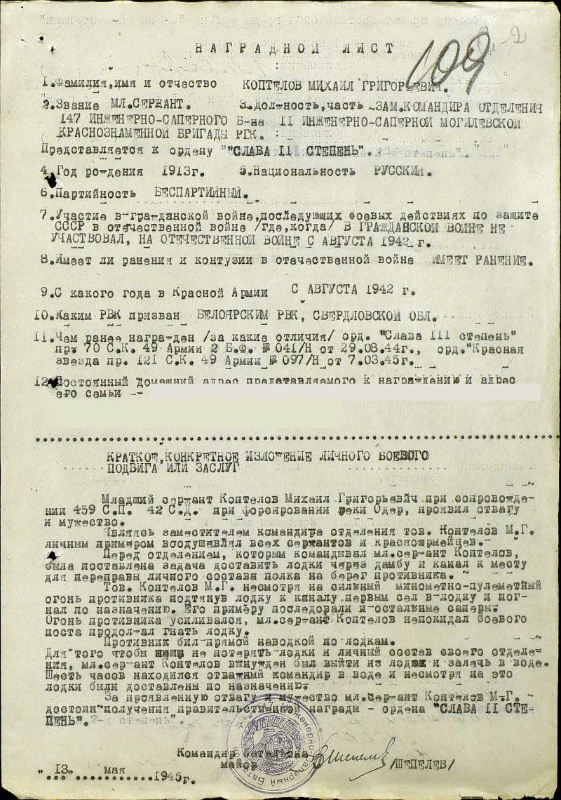 Зам командира отделения 147 инженерно-сапёрного батальона 2 инженерно-сапёрной могилёвской бригады 121 стрелкового корпуса 49 армии 2 Белорусского фронта.