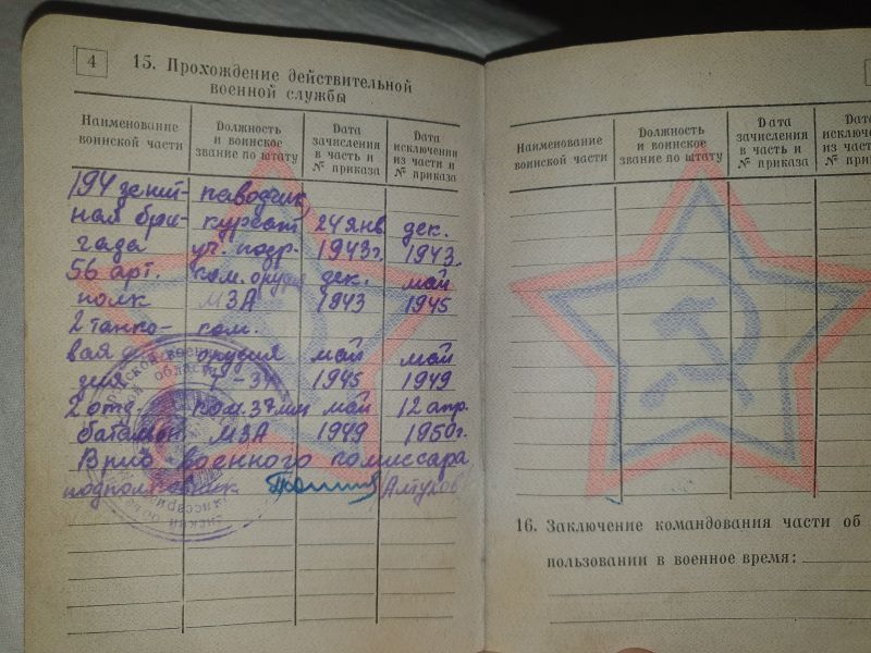 стоял на воинском учете во 2 танковой дивизии на должности командира орудия Т-34 с 1945 по 1949 гг, во 2 отдельном батальоном на должности командира 37 мм МЗА
