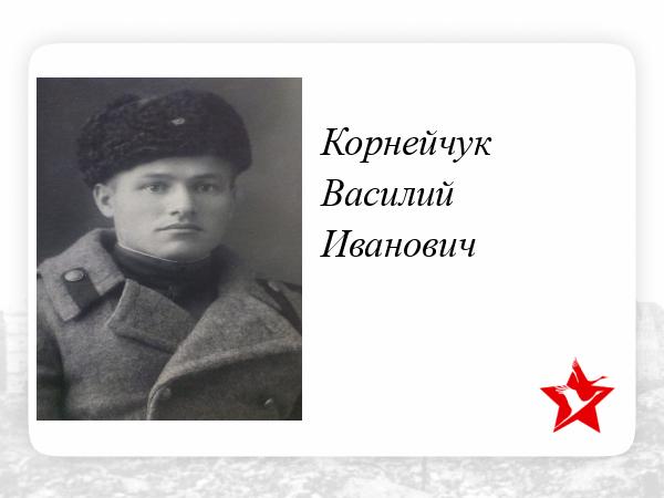 Мой дед. Родился в 1912 году в с. Бахтын, Винницкой области, УССР. Призван в Красную Армию 25 июня 1941 года Кисловодским РВК. Прошел всю войну, служил командиром телефонного кабельного взвода 22-й отдельной роты связи 19-й гвардейской стрелковой Руднянской дивизии. Воевал на полях Юго-западного, Южного, Западного, 3-го Белорусского, 1-го Прибалтийского фронтов. Дошел до Кенигсберга. Был дважды ранен, потерял ногу. За самоотверженность и мужество был награжден медалями «За Отвагу», «За Победу над Германией» и Орденом «Красной Звезды».